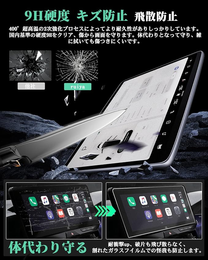 3.【硬度9H・キズ防止】400 超高温の2次強化プロセスにより、弊社の アルファード 40 カーナビ保護フィルム はより耐久性があり、強く割れにくくなります。国内基準の硬度9Hをクリア、傷から画面を守ります。体代わりとなって守り、大切なお車の価値を高く保ちます。2.5D弧形エッジ処理、破片も飛び散らなく、割れたガラスフイルムでの怪我も防止します。