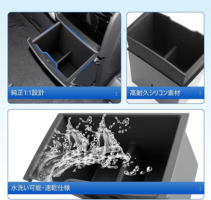 【滑り止めラバーマット付き・静音対策も万全】付属のシリコン滑り止めラバーマットは、走行中の小物のズレやガタつきを防止し、同時に衝撃音やキズを軽減。柔らかな素材で、収納物が傷つく心配もありません。汚れても取り外して水洗いできるため、清潔な状態を保つことができます。
