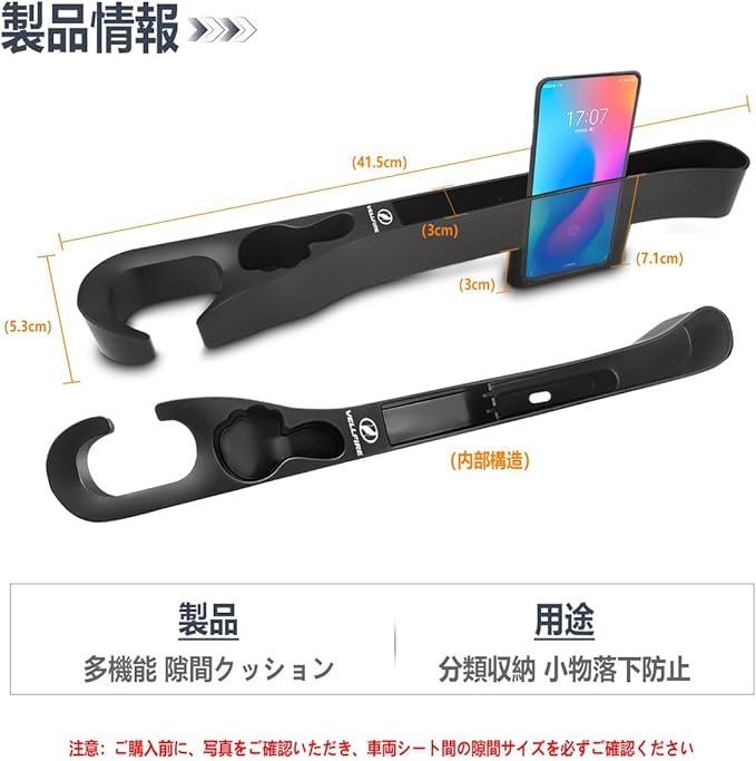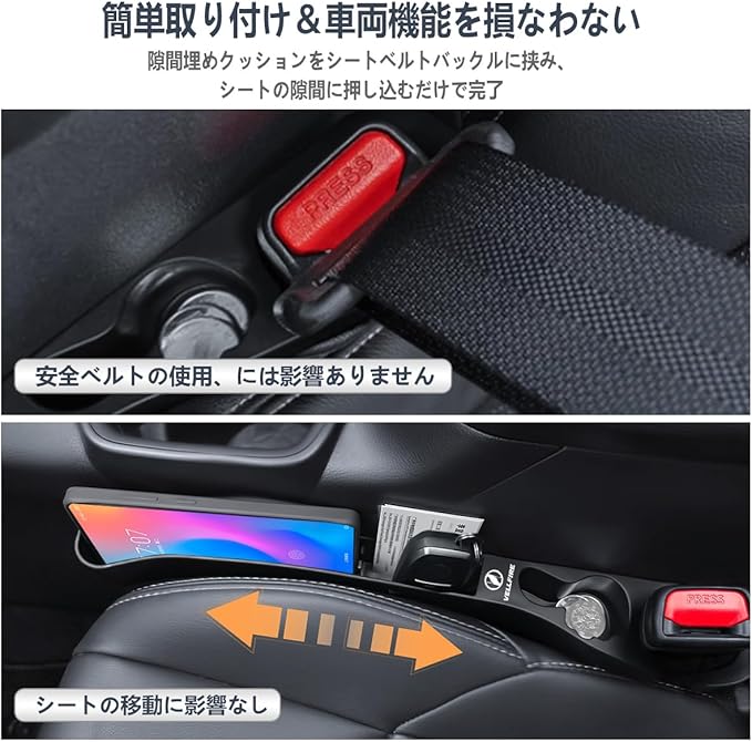 【収納スペース拡張&快適な車内環境】シートとセンターコンソールの隙間を活用し、ヴェルファイア シートサイドクッションを使用することで、より多くの収納スペースを確保。VELLFIRE隙間クッションは、車内をより快適で使いやすい空間にしますVELLFIRE隙間埋めクッションとしてだけでなく、ヴェルファイア シートサイド収納ボックスとしても活躍します。さらに、ヴェルファイアシートサイド収納ボックスは車内のデザインと一体化し、違和感なくフィットすることで、統一感を高め、より洗練された雰囲気を演出します。