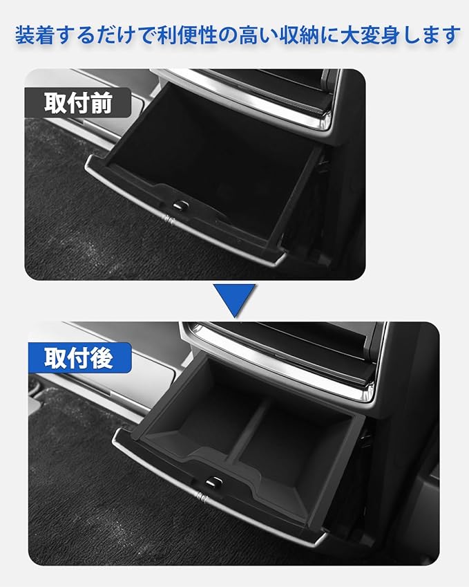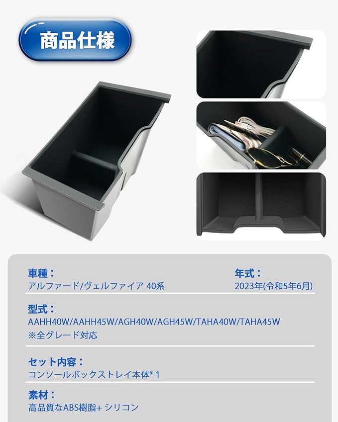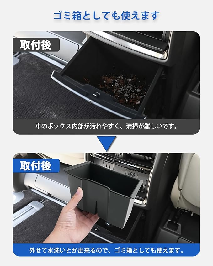 【40系乗りには必需品】コンソールリヤエンドボックス内部に仕切りがないため、物を探しにくく、中身が乱れて、充電ケーブルが絡まることは非常に不便ですね。弊社のアルファード/ヴェルファイア 40系専用設計リアマルチボックスを装着するだけで、汚れたら取り外して洗えるので、ゴミ袋をセットしてゴミ箱としても使えます。