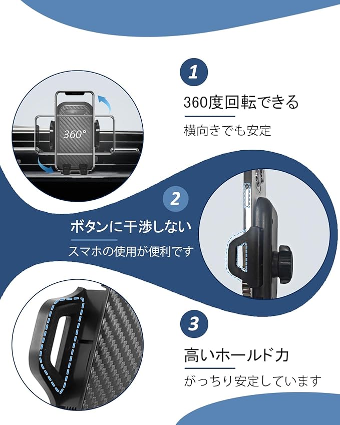 【横置きタイプ】360度回転できるボールジョイントを利用して、横向きでも安定です。縦向きでナビとして使用しても、横向きで動画を視聴しても実現できます。