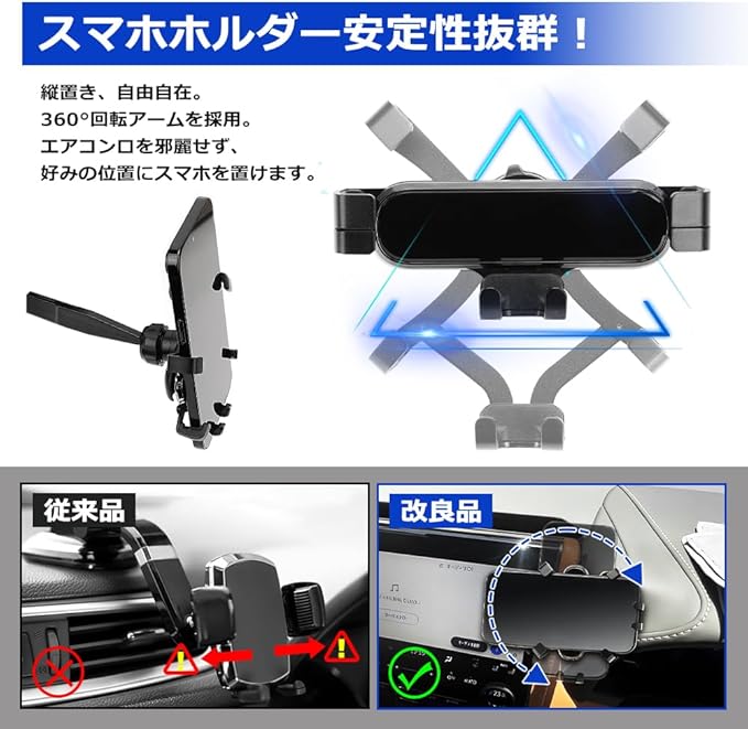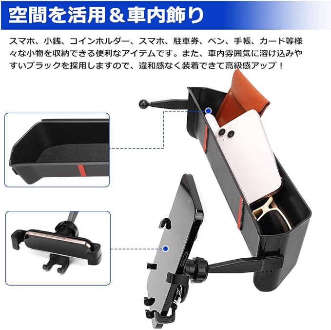 【スマホホルダー&安定性UP!】 車内収納ボックスだけでなく、スマホホルダーも付いています。360度回転するボールジョイント方式を採用、お使いのスマホを縦でも横でも自由にお使い頂け、スマホホルダー部は片手で操作ができる仕組みとなっており、スマホを設置し左右を固定部分でワンタッチロック。安定した三角形の構造により、スマホの重量が重すぎて耐えられないことを心配しません。