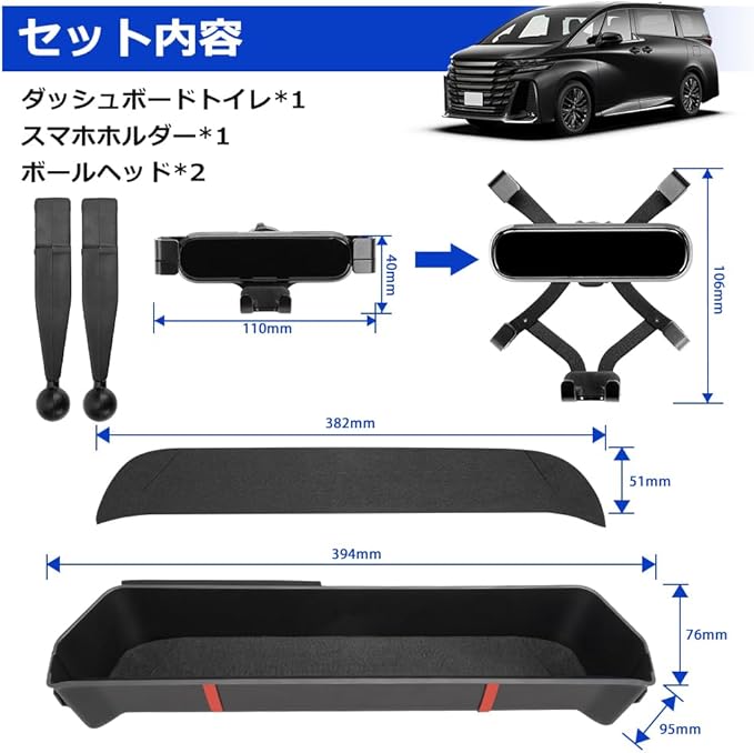 【アルファード専用&簡単装着】 トヨタ アルファード 40系 ヴェルファイア専用設計で、ディスプレイオーディオにぴったりフィット。このコンソールトレイは、スマホホルダーを付いて、スマホも小物も、すぐ手の届く場所に。 ▼対応車種:トヨタ アルファード 40系/ヴェルファイア 40系(TOYOTA ALPHARD VELLFIRE) ▼年式:令和5年6月~現行 ※年式・グレード・オプション等により適合しない場合が御座います。形状をご確認いただいた上、お買い求めください。 ▼セット内容:ダッシュボードトレイ*1、滑り止めマット*1(フェルト仕様)、スマホホルダー*1、ボールヘッド*2 裏面には両面テープが付いています、両面テープを剥がして中央のナビゲーション隙間に置くだけで、取り付け簡単、運転席の視線も妨げません。