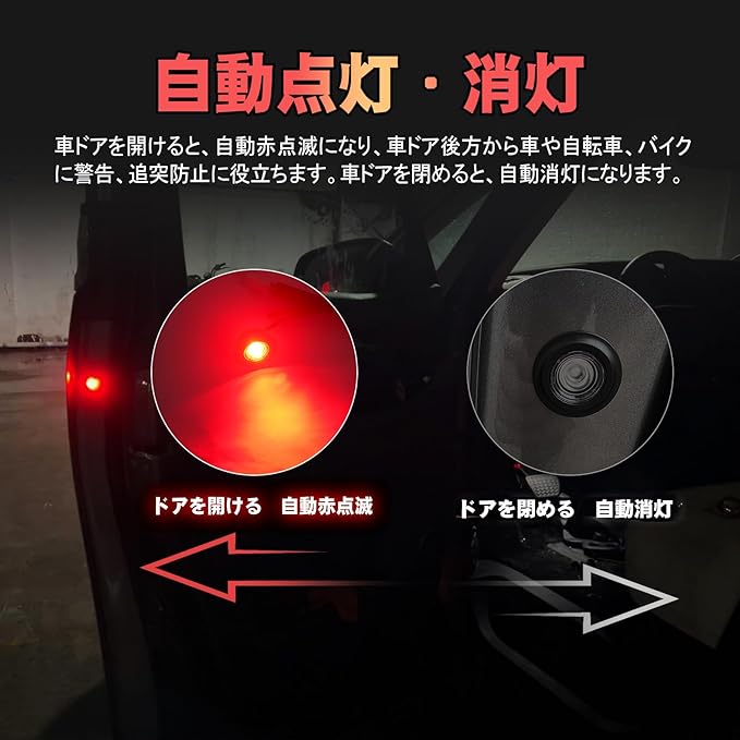 【自動点灯・消灯】車ドアを開けると、自動赤点滅になり、車ドア後方から車や自転車、バイクに警告、追突防止に役立ちます。車ドアを閉めると、自動消灯になります。