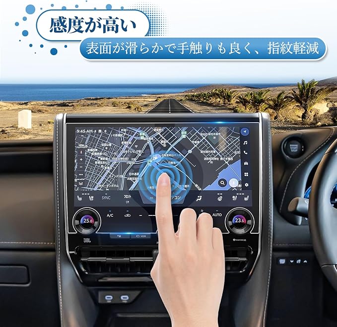 【指紋防止・カースクリーン保護】指紋防止コーティングを施し、指がフィルムに触れても指の油分が残りにくく、ヴェルファイア 40系の後席ディスプレイを保護します。 指紋・油汚れ・水汚れに強く、汗・皮脂・化粧品等が画面に付いても拭き取るだけです。 自由かつ快適に操作できます。 ほこりの多い環境では、ほこりによる液晶画面の汚染を防ぎ、スクリーンの清潔感を効果的に保護し、耐用年数を延ばします。