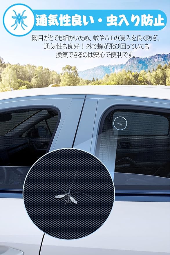 【日除け車網戸】超細いメッシュ穴の設計、光を有効に遮断できます。通気性も良いで駐車しながら冷房と合わせて使用して車内の温度を速くに下げます。遮光、省エネの車用網戸です。