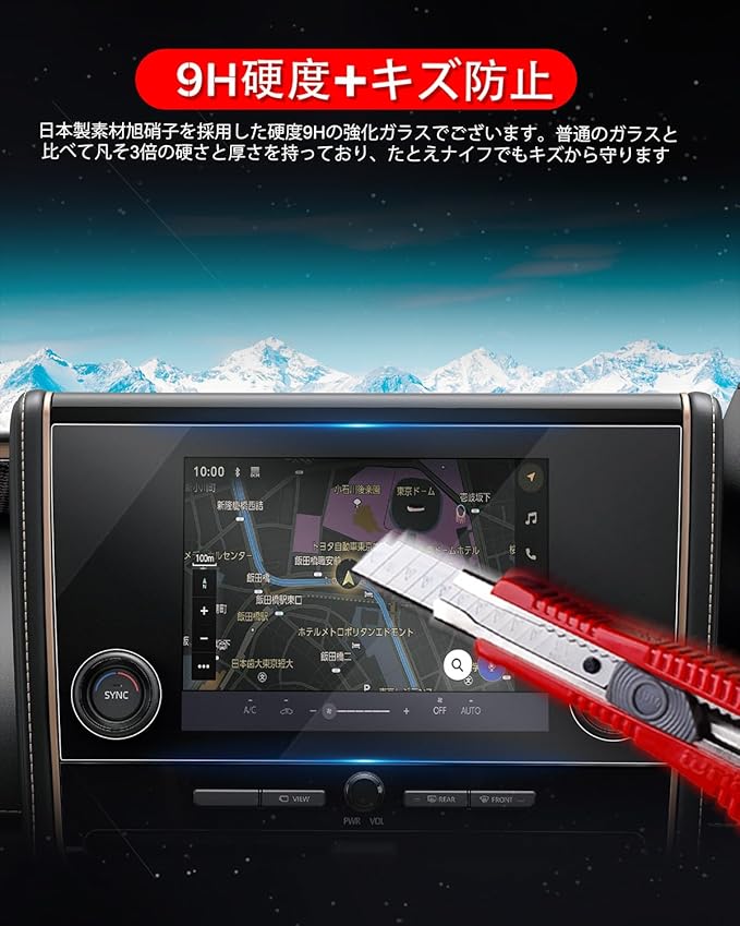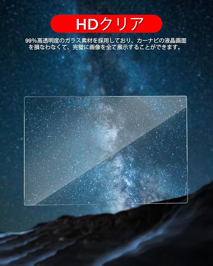 「特徴」:HDクリア、キズ防止最適、自己吸着タイプ、気泡なし、9H硬度、貼り付けも簡単、ARコーティング、疎油性、撥水性、飛散防止、汚れ防止