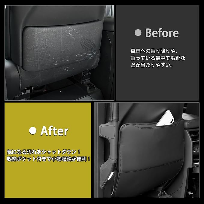 3.【高級マイクロファイバー&お手入れ簡単】車内雰囲気に溶け込みやすいブラック、気品に満ちた車内空間に違和感なく装着できます。後部座席のお子さまがシートを蹴って付ける汚れや傷なども心配することなく、雑巾で簡単に拭き取ります。また、耐摩耗性および耐久性に優れる高級マイクロファイバーを採用し、厚み1.8㎜の高密度でクッション性が高く、車体に優しいです。