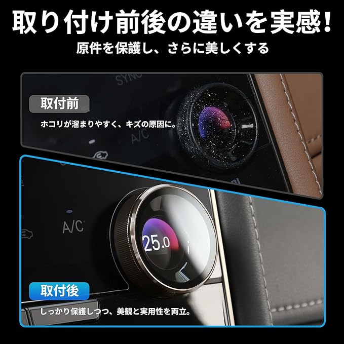 【強化ガラス素材でしっかり保護】高硬度の強化ガラスを採用し、エアコン操作ノブを日常使用によるキズ・汚れ・指紋・摩耗からしっかり保護しま高透明で操作性を損なわない透明度の高いガラス素材により、表示が見やすく、視認性はそのまま。装着後も回転操作がスムーズで、純正ノブ本来の操作感を維持します。す。頻繁に触れる部分だからこそ、劣化を防ぎ、美しい状態を長期間キープできます。