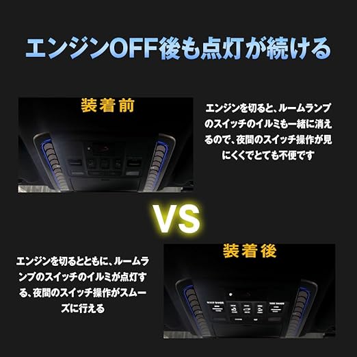 本製品を取付ると、エンジンオフ後にも点灯し続け、スライドドアやバックドアスイッチの位置がはっきりわかり、夜間エンジンオフ後のスイッチ操作が便利になります。