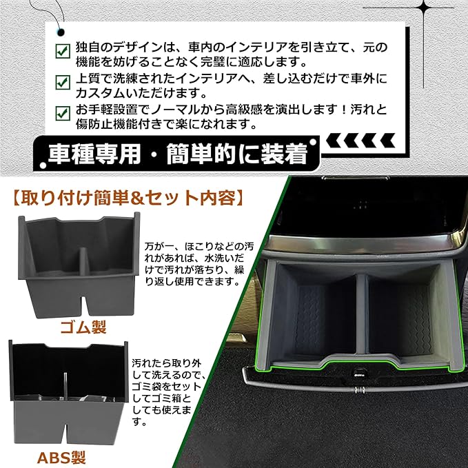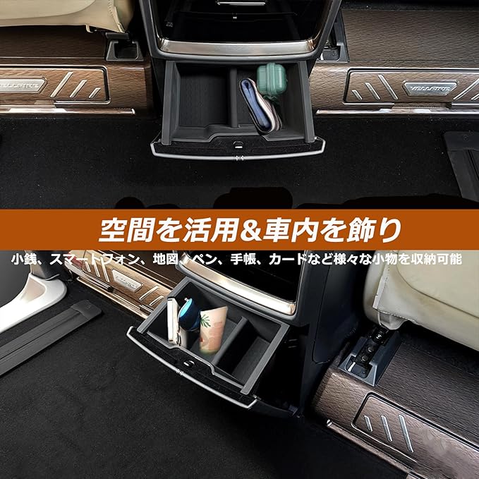【簡単に取付】:アルファード/ヴェルファイア 40系車種専用の設計で、ツールは一切必要なし、ボックスを車内にはめるだけで装着完成します。工具不要で脱着も簡単です。機能性だけでなくデザイン性にも優れており、車内のカスタマイズを考えている方には特におすすめです。セット内容:ABS製リアマルチボックス本体*1、ゴム製リアマルチボックス本体*1