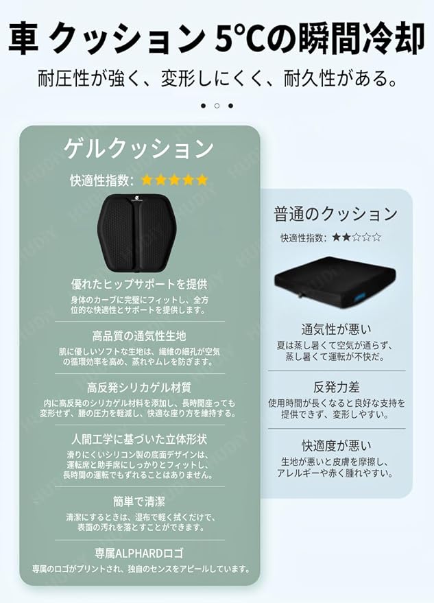 HUDIY(フーディ)ゲルクッション 高通気性 ジェルクッション アルファード 40系(2023年6月~現行) 車種専用 座布団 高反発 ジェルクッション シートクッション 体圧分散 クッション車 お尻が痛くならない ハニカムゲルクッション 冷感 滑り止め 蒸れない