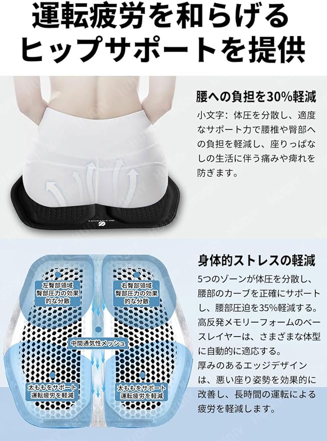 [優れた放熱性能] 表面の通気性生地と内部ハニカム形状ゲル材質は優れた放熱特性を持ち、臀部から発生する熱を迅速に追い払うことができ、暑い夏でもクッション表面を乾燥させ、蒸し暑さと湿気を避け、運転過程を常にさわやかで快適に保つことができる。