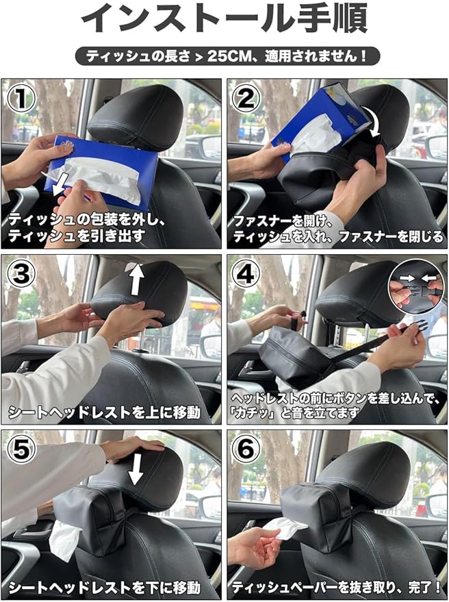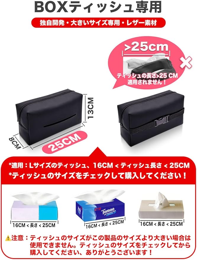[大きいサイズ] この車用ティッシュボックスのサイズは25*13*8cmで、一般的な製品と比べて幅が広く、様々な種類のティッシュを簡単に収納することができます。 家族旅行でも、長旅でも、活躍すること間違いなしです。