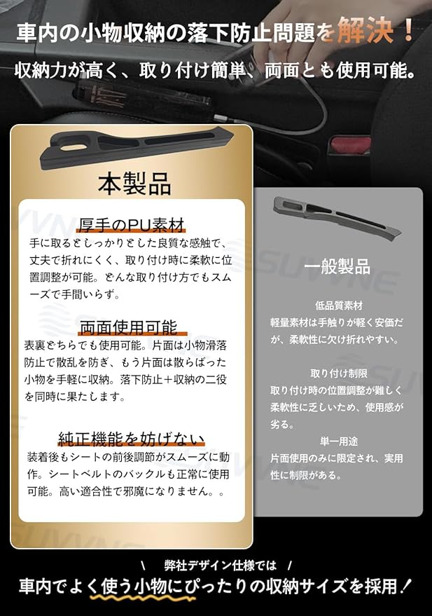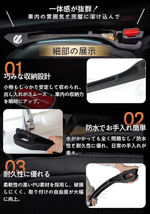 【落下防止】シート隙間を完全に埋める設計で、急ブレーキやカーブ走行時の小物落下をしっかり防ぎ、ドライブの安心感を高めます。
