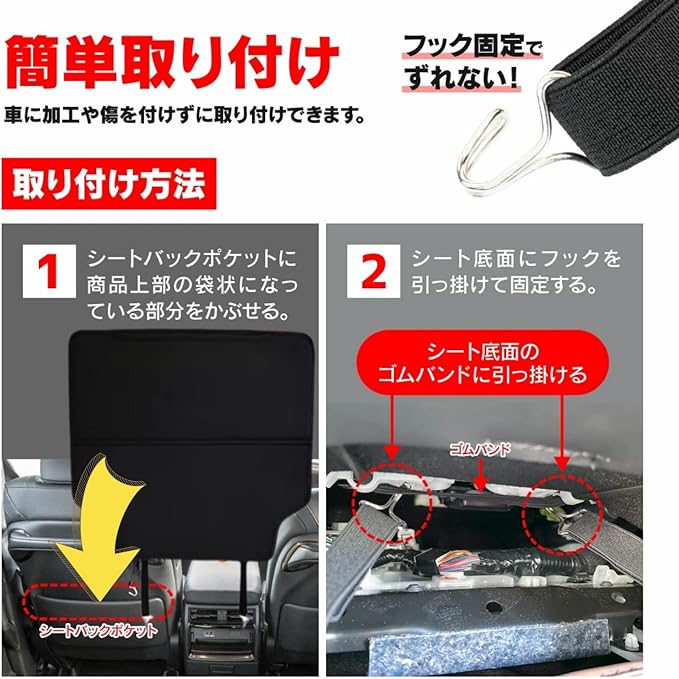 【簡単貼り付け】:キックボードの上部はバックルで収納袋に固定され、下部はフックをゴムベルトに取り付けてからフックでシートの底部に固定して簡単な作業です。(装着位置に汚れ物をきちんと拭き取ることをお願いいたします)