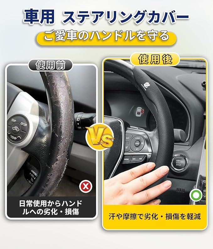 【劣化と損傷軽減・優れた耐久性】弊社の ステアリングホイールカバー はハンドルを優しく包み込め、日常的な使用から爪の引っかきや汗染みなどの劣化と損傷から守れます。更に、市販の合皮製保護カバーとは異なり、ABS樹脂と柔らかいPUレザーで作られる本製品は柔らかさを確保しながら耐久性に優れて、長期間使用してもひび割れず、変形しにくいです。