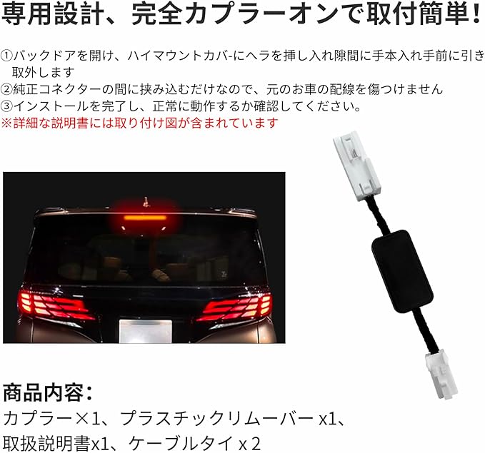 取付要領 :専用設計、完全カプラーオンで取付簡単! ①バックドアを開けハイマウントカバーの隙間に手を引っ掛け下に引き取外します ②純正コネクターの間に挟み込むだけなので、元のお車の配線を傷つけません ③インストールを完了し、正常に動作するか確認してください。