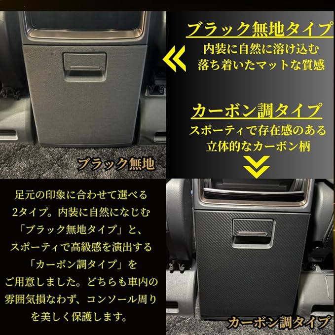 アルファード/ヴェルファイア40系 専用設計のセンターコンソール用キックガード(新改良モデル)です。 後席足元でキズや汚れが付きやすいセンターコンソール部分を、取っ手部分まで含めて全面保護するフルカバー設計。柔軟性の高い素材を使用することで、局面や端部にも自然にフィットし、まるで純正パーツのような一体感のある仕上がりを実現しています。 従来モデルでご要望の多かった「シワが付いた状態で届く」「貼りにくい」といった点を改善し、フラット梱包仕様に変更した新改良版として発売しました。 開封後すぐに貼り付けができ、施工性も向上しています。 カラーは、内装に自然になじむ落ち着いた印象の「ブラック無地タイプ」と、スポーティで存在感のある「カーボン調タイプ」の2種類をご用意。 足元の雰囲気やお好みに合わせてお選びいただけます。 実車にて装着確認を行い、フィット感・見た目・施工性を確認したうえで商品化しています。