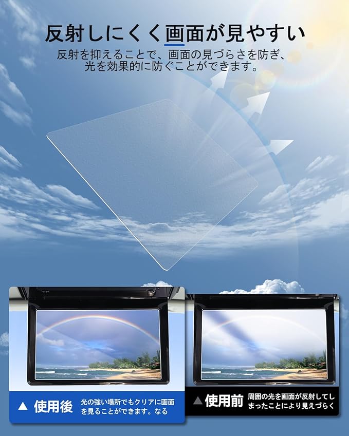 【反射を大幅にカット!】まぶしくて見えづらい――そんな経験、一度や二度ではないはず。特殊なAR(アンチリフレクト)加工により、強烈な日差しや照明の反射で画面が白っぽくなるあのストレスを大幅にカット、余計な映り込みを抑え、画面の内容がパッと目に入る。