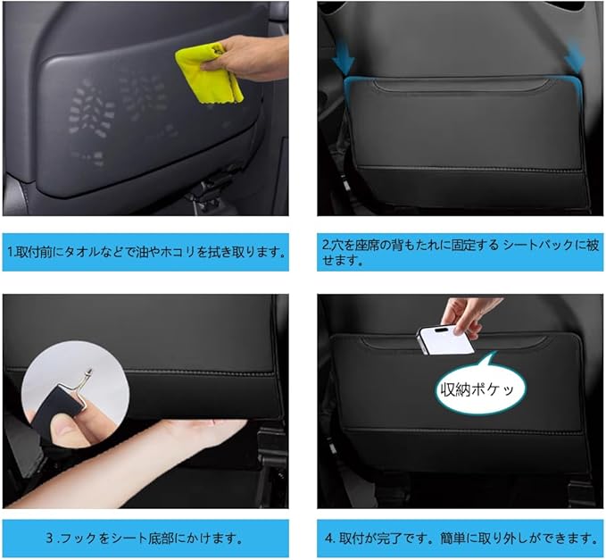 簡単取り付けで手間いらず:1.取付前にタオルなどで油やホコリを拭き取ります。2.‘穴を座席の背もたれに固定する 商品シ一トバックに被せます。3 .フックをシ一ト底部にかけます。4. 取付が完了です。簡単に取り外しができます。繰り返し使用できます。 しっかりと固定され、外れにくい。