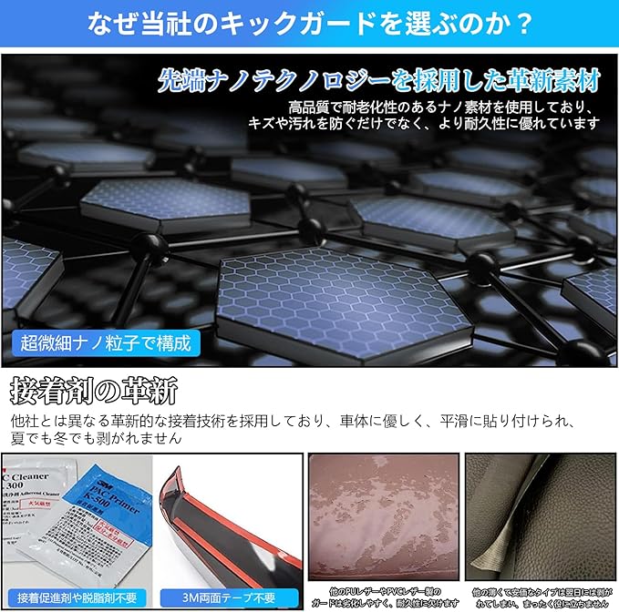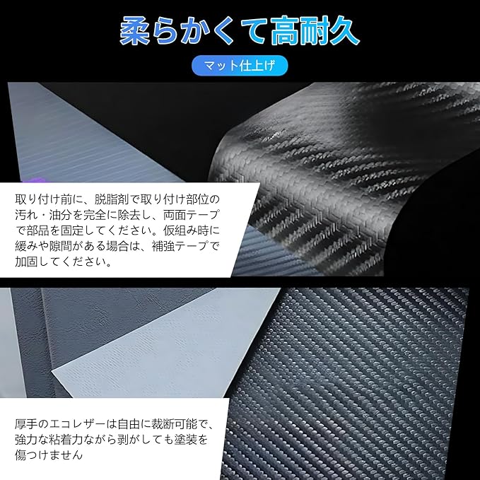 乗降時の擦り傷や汚れをしっかり防止。高耐久PVCレザーと3Dカーボン調デザインを採用し、耐摩耗・防水でお手入れ簡単。