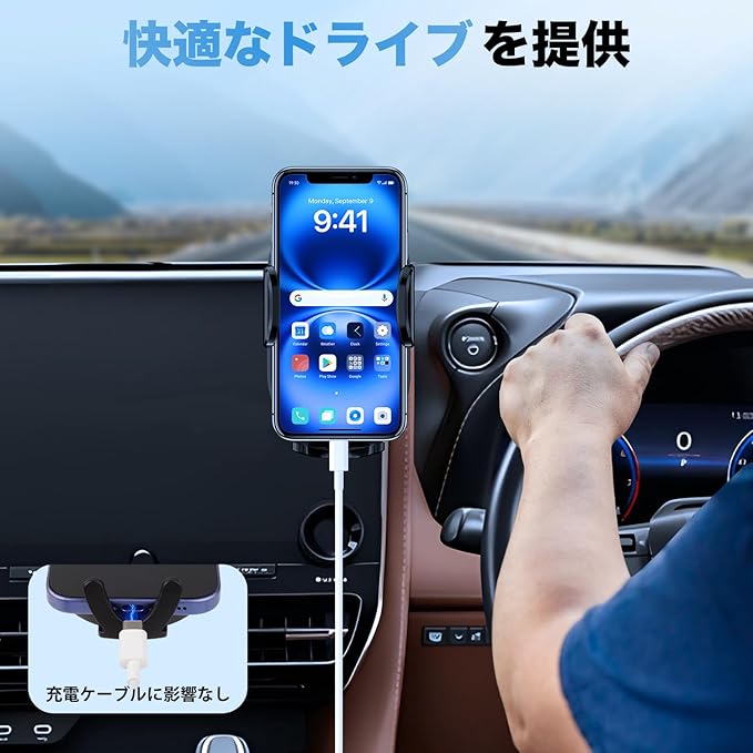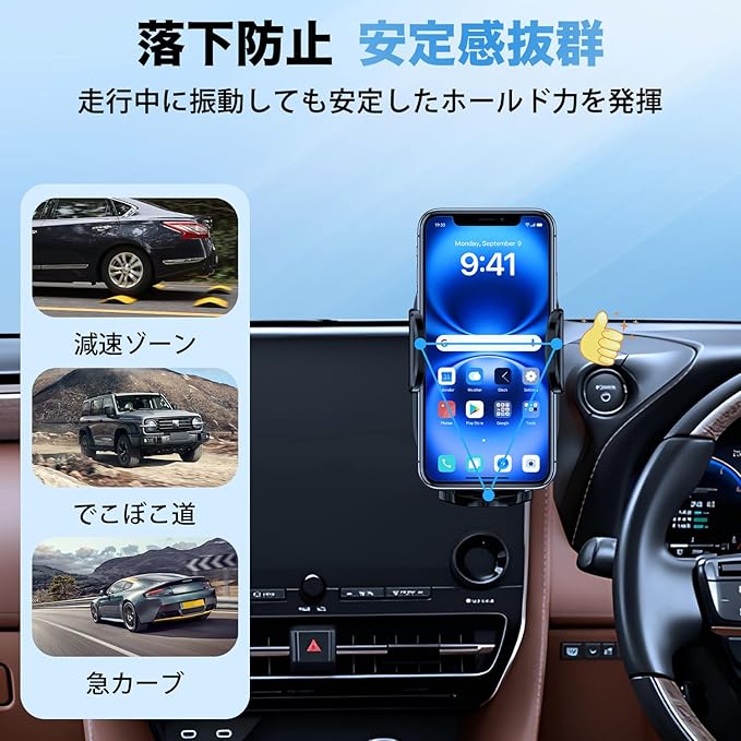 4.【安定感抜群&片手操作】:本製品はクリップ固定ですので、安定性抜群で、減速バンプや急ブレーキの場合でも、落下防止できます。また、その操作も簡単で、スマホを解除する場合、ワンタッチで後ろのボタンを押すだけ良いです。
