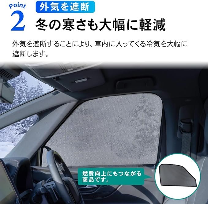 POINT.1 「暑さ・紫外線を大幅カット」 暑さを和らげるのはもちろん 紫外線も大幅カットします。 ・POINT.2 「冬の寒さも大幅に軽減」 外気を遮断することにより、車内に入ってくる冷気 を大幅に遮断します。