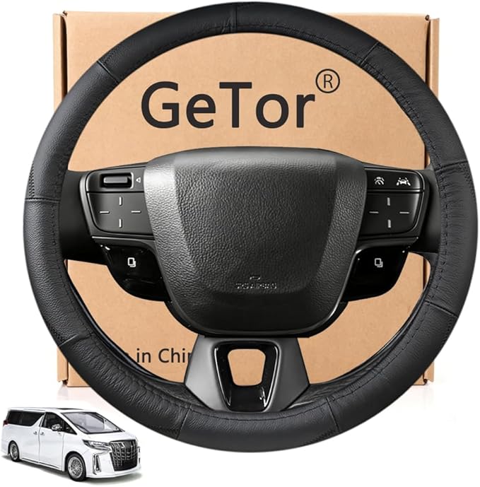 [GeTor] アルファード ハンドルカバー 牛革 ステアリングカバー トヨタ 専用 アルファード Alphard 20系 30系 40系 車ハンドル 保護カバー 円形 37.5cm 耐摩耗性 汚れ防止 滑り止め 簡単取付 内装パーツ アクセサリー 車用品 (ブラック線)