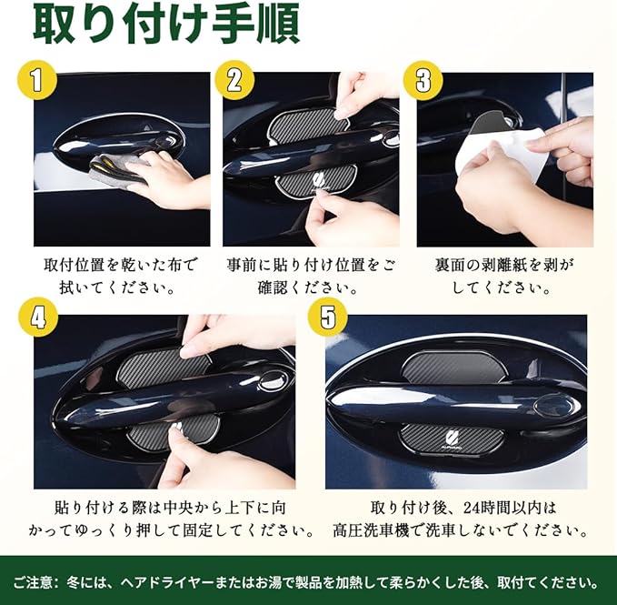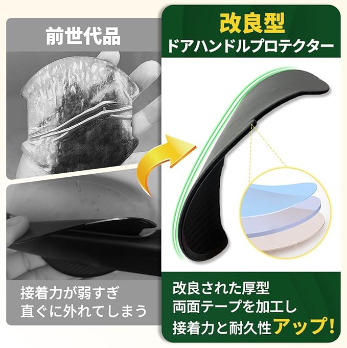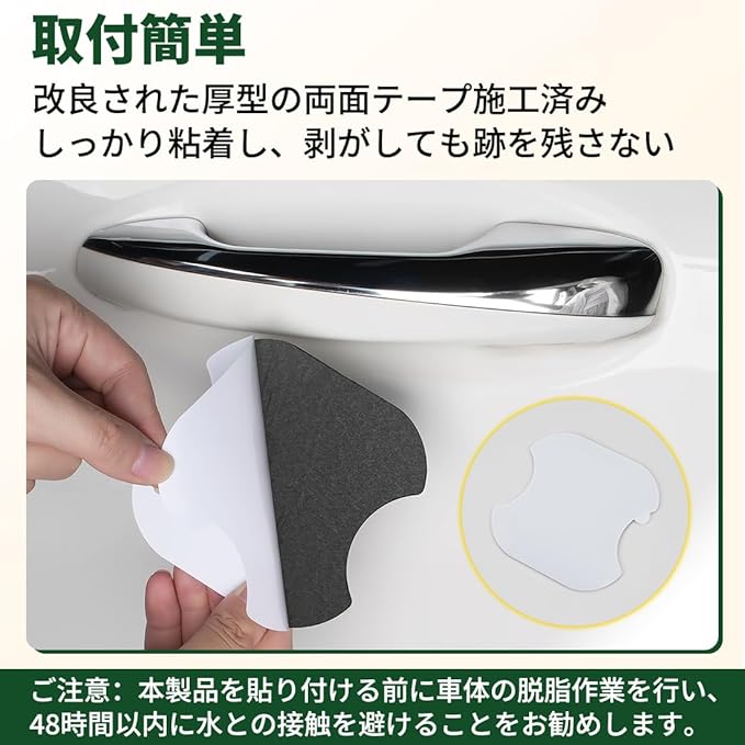 【改良型テープ・粘着力向上】前世代品と比較して、この改良版ドアハンドルプロテクターは改良型の厚型の両面粘着テープを加工するため、接着時間が長いほど強度が増します。さらに、本製品は屋外で耐久テストに合格しており、取り付け後数日経っても剥がれることなく、車体にしっかり貼り付けます。ご注意:取り付け前に車のボディ面の脱脂作業を行い、また48時間以内に水との接触を避けることをお勧めします。