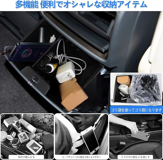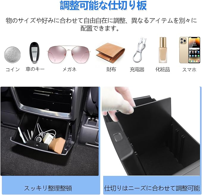 【多機能&便利な収納アイテム】収納力をアップして整理整頓に活用できます。革新なスペース分け設計で、財布、スマホ、カード、コイン、メガネ、鍵、化粧品、充電器などをスッキリ収納でき、小物の紛失を防止します。車内の小物収納スペースを快適に保つために設計された便利なアイテムです。