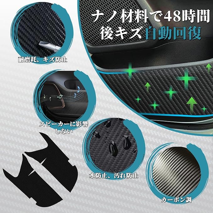 【高品質ナノ製革新の材質&カーボン調】最先端のナノテクノロジーを通して、普通の商品のPUレザーやPVCレザー材質と違う劣化防止に強い高品質ナノ製革新の材質を採用し、キズ・汚れ防止にはもちろん、耐久性がさらに躍進を遂げます。衝撃を吸収しやすいので破損しにくいのも非常に魅力的です。車内雰囲気に溶け込むカーボン調、気品に満ちた車内空間に違和感なく装着できます。