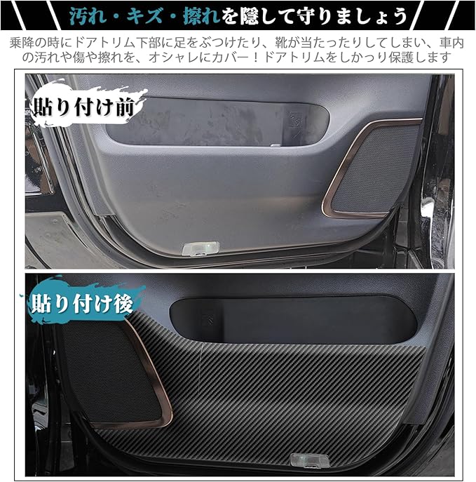 【傷・汚れ防止・保護】:乗降の時にドアトリム下部に足をぶつけたり、靴が当たったりしてしまい、車内の汚れや傷や擦れを、オシャレにカバー!フィット感はバッチリで、シートを貼ったようには見えず、最初からのデザインのように見えます。汚しても雑巾で簡単に拭き取り、お手入れもラクラク。シートも既に擦り傷だらけになってしまっても現車損耗なくシートを張り替えればいい楽な作業です。