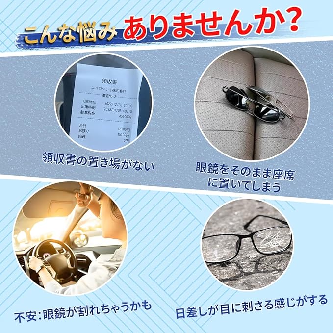 【便利な収納ツール】メガネだけでなく、駐車券やETCカード、領収書などの小物も収納可能です。車内を整理整頓された状態に保ち、必要な時にすぐに取り出せます。