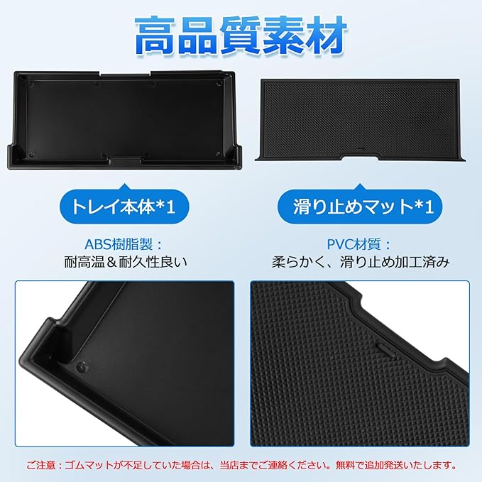 3.セット内容&素材:トレイ本体*1、滑り止めマット*1。トレイ本体はABS樹脂を採用し、耐摩擦性と耐熱性に優れているため傷つきにくく、高温の環境でも変形しません。マットは滑り止め加工済みで、運転中の振動による転回やズレを防止し、カタカタ音を軽減します。