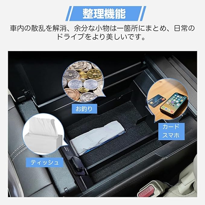 【整理整頓で車内を美しく】スマホ、コイン、カード、チケット、ティッシュなど、散らかりがちな小物を一括収納。視界の妨げや小物の紛失を防ぎ、運転中もスッキリ快適。いつでも清潔で整然とした空間を保ち、上質なドライブ時間をお楽しみいただけます。