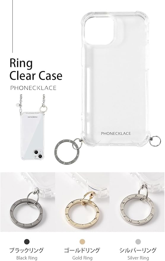 PHONECKLACE「ストラップ用リング付きクリアケース」はチャーム付きで、ストラップやキーチェーンなどの取り付けに適したiPhoneケースです。