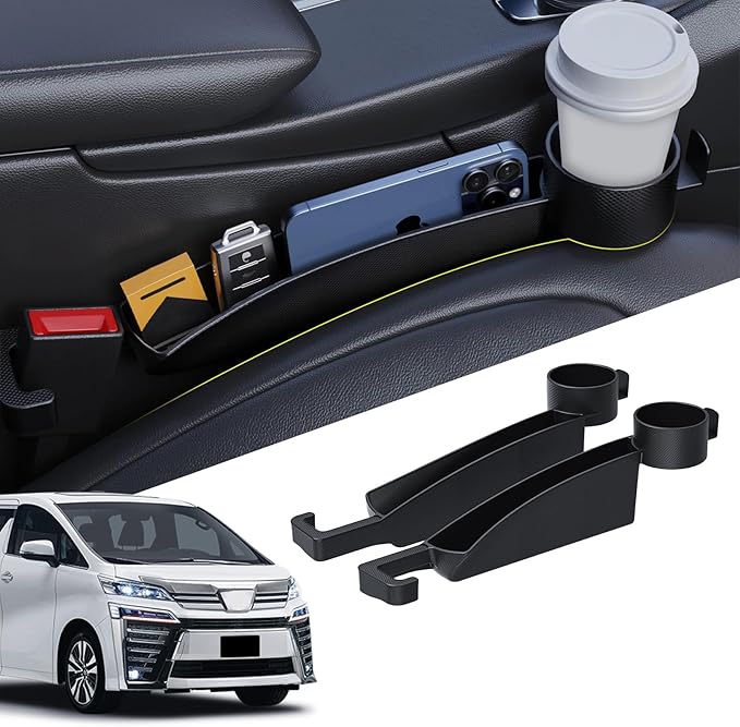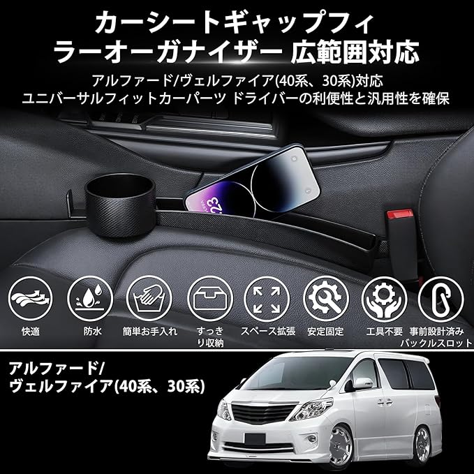 ALPHARD・VELLFIRE 隙間クッション 車用 シート隙間埋めクッション アルファード シートサイド カップホルダー + フック + 充電線挿す孔がある アルファード・ヴェルファイア 30・40 系 シート隙間埋め アクセサリー スマホ収納可能 落下防止 内装パーツ 運転席/助手席 2個入り (ブラック)