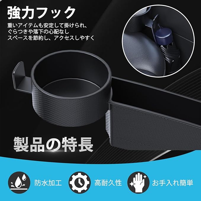 【大容量&便利な機能で快適に】最深部7.5cmの大容量設計で、急な加速でも中身が飛び出す心配がありません。専用ドリンクホルダー(直径約7.5cm 高さ15cm以下、容量約0.6Lのボトル・マグカップ対応)と、耐荷重2kgのフックを装備。スマートフォンや小物入れ、500mlのペットボトルなど、日用品をしっかり収納できます。