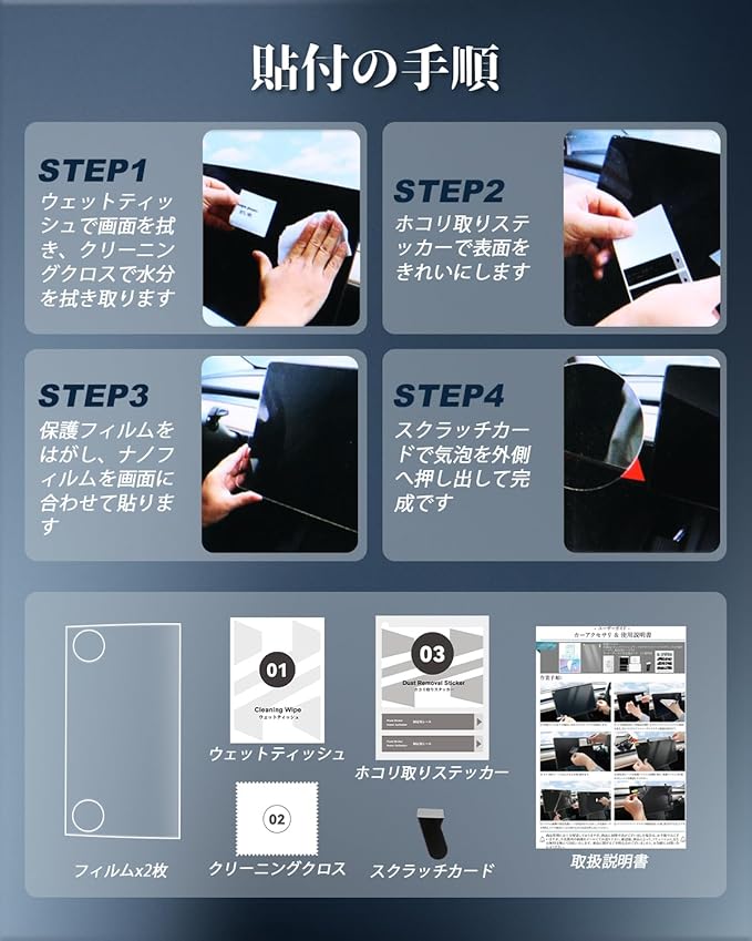 【簡単に貼り付け】BIBIBOのアルファード40系 Xグレード専用フィルムは簡単に画面に貼り付けることができます。製品に付属のクリーニングクロスを使用してスクリーンをきれいに拭き、スクリーン上のフィルムを軽く押すだけで、自動的に吸着されます。気泡が残っていることを気にしないでください。基本的に気泡はあまり残りません。気泡が発生した場合は、指先で絞るだけで安心してご使用いただけます。