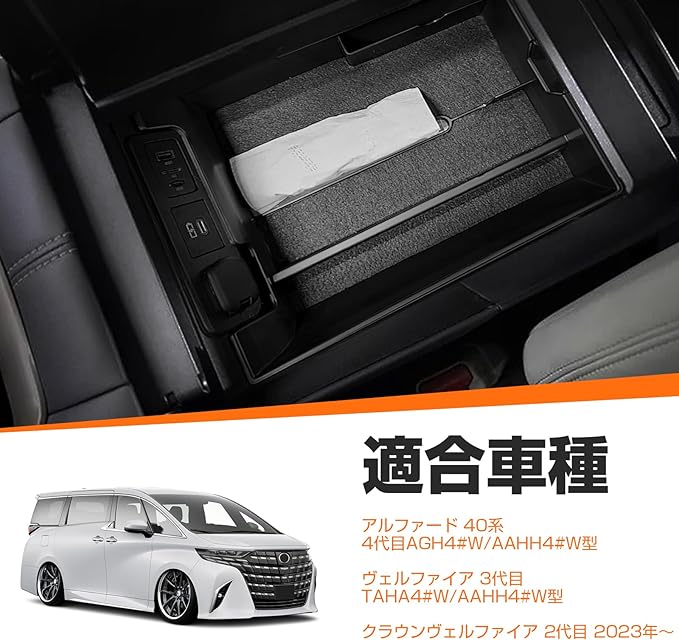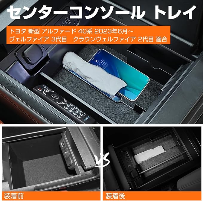 【適合車種】本センターコンソール トレイはトヨタ 新型アルファード 40系 AGH4#W/AAHH4#W型 ヴェルファイア 3代目 TAHA4#W/AAHH4#W型 クラウンヴェルファイア 2代目 2023年~ に適用する。※年式・グレード・オプション等により適合しない場合が御座いますので、サイズと形状をご確認の上に購入ください。