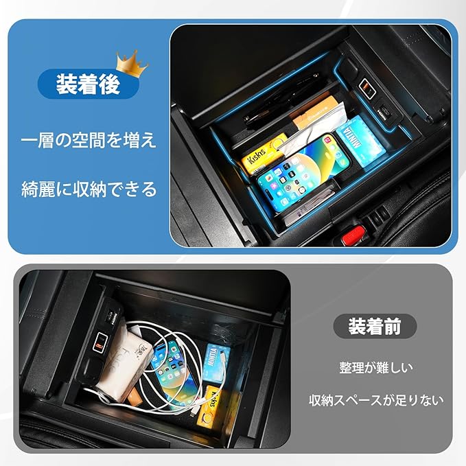 3.【プロ仕様の仕分け収納】:深かったセンターコンソールが2段構造になり、しかも、メガネ・コイン・カードを完全収納!車内散らかり防止、スッキリと整理整頓し、車内空間をキレーに!