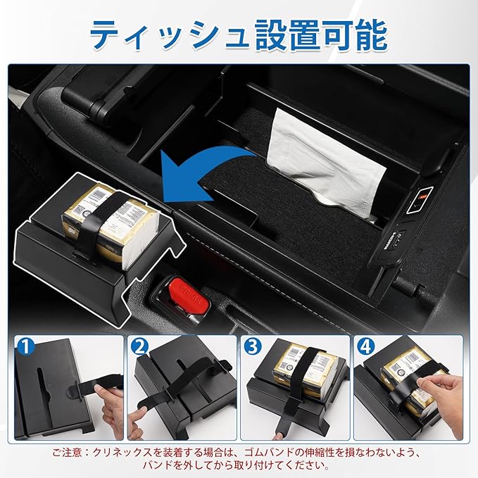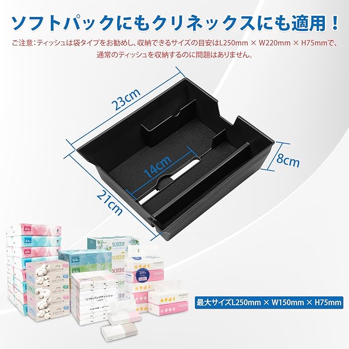 2.【小物収納には抜群】:トレイ上段にはいくつかの収納エリアに分割されており、携帯電話やカード、鍵やデータケーブルなどをスッキリ収納できます!トレイ下段にはティッシュ設置可能です。【ご注意】:ティッシュ設置は袋タイプをお勧めし、収納できるサイズの目安はL250mm W150mm H75mmで、通常のティッシュを収納するのに問題はありません。