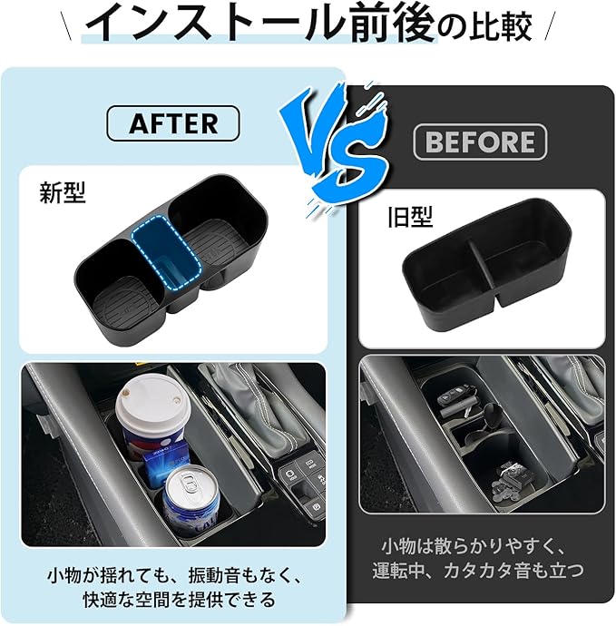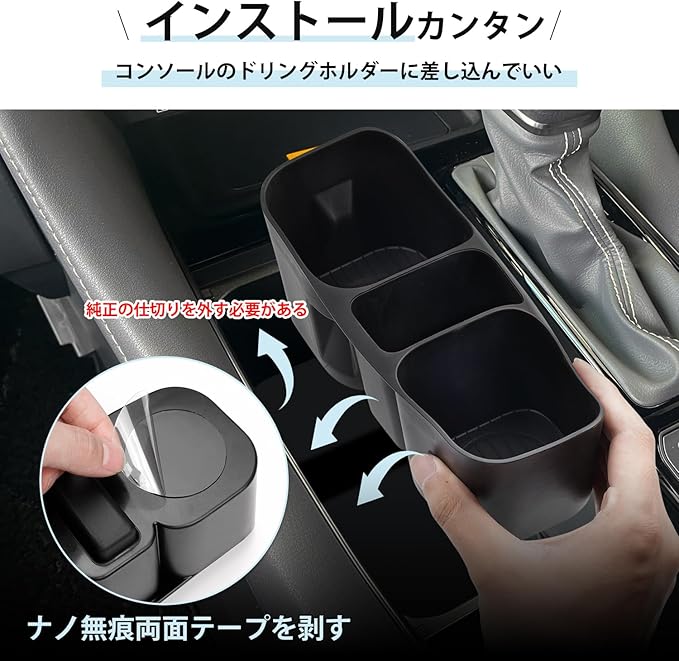 4.【簡単に取付】:本製品の底面はナノ無痕両面テープを付属しておりますので、装着前、そのテープを剥がしてから、センターコンソールのドリンクホルダーに差し込むだけで簡単な取付で、違和感も無く便利です。その固定性も良いです。また、テープを剥がしても痕が残らない。ご注意:元ドリンクホルダーの仕切りを外す必要があります。