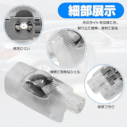 【取付簡単】カーテシランプのカプラーを外し、本製品と差し替えるだけの簡単作業で、穴あき不要、配線加工も不要です!あなたの愛車を傷つけることなく簡単な取り付けでOKです!【商品仕様】電圧:9-12V。色温度:6500k。出力:5W 。材質:難燃性材料。使用温度:40 - +105℃。走行コンピュータ上に誤提示や警告がなく、直接原車部品を交換し、配線や線路を修正する必要がありません。※原車の設定を変更しないで、負荷抵抗を叩いたり、原車の線路を交換しないでください。