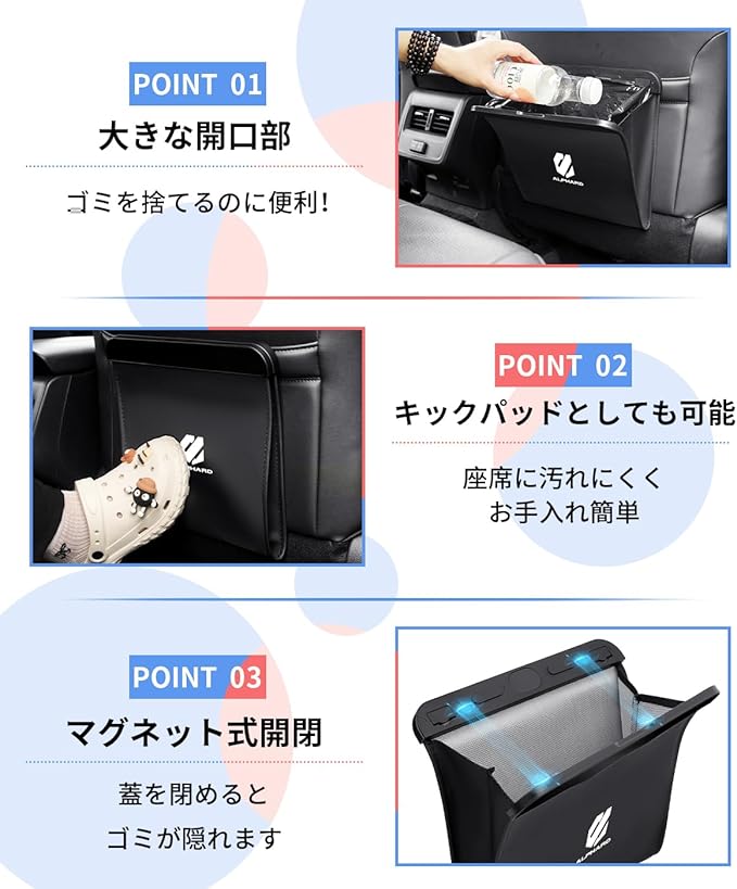 【大きな開口部・マグネット式で開閉簡単】レザーゴミ袋の開口部は長さ25cm、開封後は幅14cmまで広がり、果物の皮や空き缶などを捨てやすくなります。内蔵マグネットでゴミ袋を簡単に開閉できます。蓋を閉めれば車内のゴミが隠されました!車内の清潔感とインテリアのおしゃれさを保ちます。
