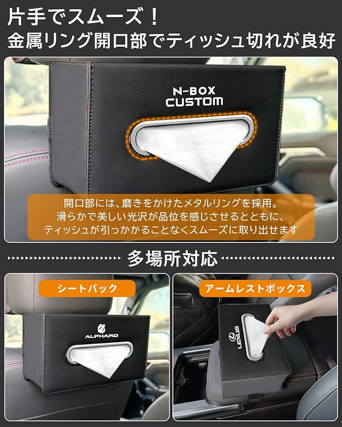 【片手でスムーズ!金属リング開口部でティッシュ切れが良好】 開口部には、磨きをかけたメタルリングを採用。滑らかで美しい光沢が品位を感じさせるとともに、ティッシュが引っかかることなくスムーズに取り出せます。さらに、この構造によりティッシュの断ち切れも良好。利き手に関係なく、片手操作が可能なので、運転中や後部座席の方が使用する際にも、大変便利で安全です。細部まで使い心地を追求しました。
