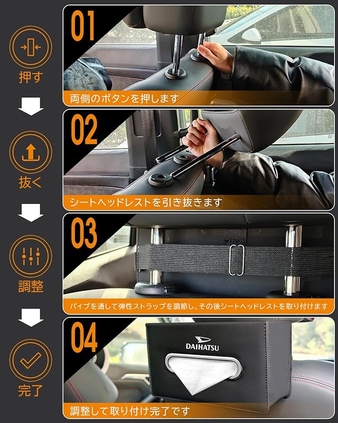 【伸縮性バンドで簡単設置!ほとんどの車のヘッドレストにフィット】 面倒な工具や複雑な工程は一切不要。付属の高弾性ストラップをヘッドレストに引っ掛けるだけで、あっという間に設置完了。強い伸展性により、ほとんどのセダンやSUV、ミニバンのヘッドレストにしっかりと固定されます。走行中の揺れでもずれ落ちる心配がなく、安定感も抜群。ご自身の愛車にぴったり合うかどうか、という不安を解消します。