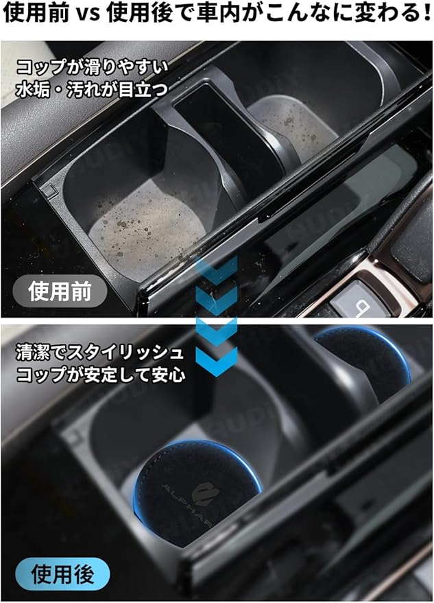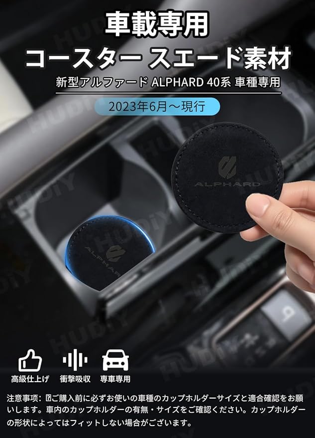HUDIY(フーディ)アルファード 40系 専用 車載カップコースター 70mm 直径 専用ロゴ印刷 高摩擦ブラックスエード 滑り止め スポンジ三層構造 ブラックステッチ ノンスリップ 防水 防塵 車内インテリア ギフト 2個セット