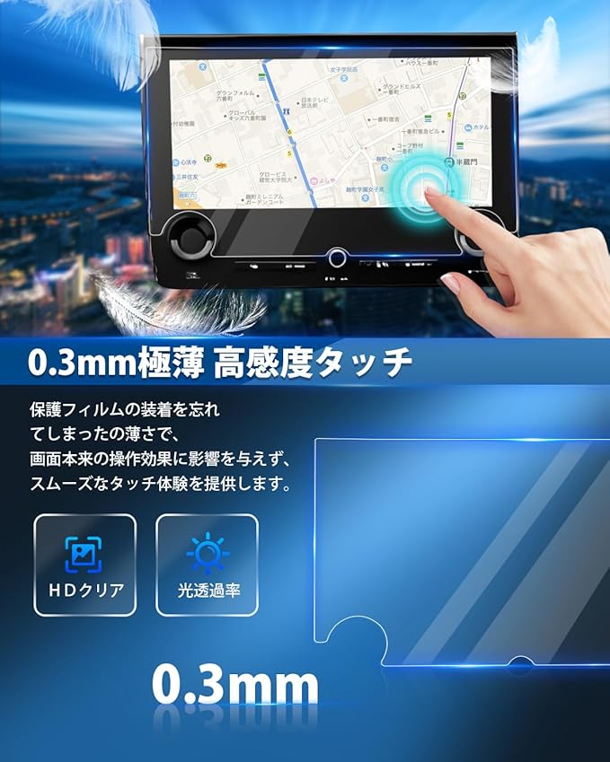 2.【高感度タッチ・極薄】:専用車種の設計を採用し、実車のスクリーンサイズに合わせて設計・製作し、製品がスクリーンによくフィットします。耐久性と反応性を犠牲にすることはない保護フィルムの極薄な厚さです。画面本来の操作効果に影響を与えず、スムーズなタッチ体験を提供します。保護フィルムの装着を忘れ、ナビの画像を完璧に映し、快適な視聴体験を提供します。